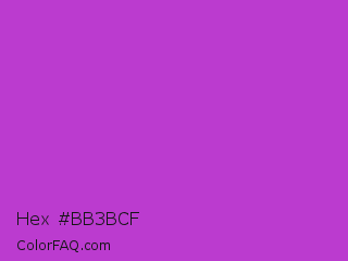 Hex #bb3bcf Color is a normal magenta color and the nearest color is Steel Pink #cc33cc. Hex code #bb3bcf and RGB value is rgb(187,59,207). In RGB color space, this color is composed of 73% red, 23% green, 81% blue, In CMYK color space, this color is composed of 10% cyan, 71% magenta, 0% yellow , 19% black , In HSL color space, this color has a hue angle of 292° , 61% saturation and 52% lightness.
