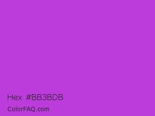Hex #bb3bdb Color is a normal purple color and the nearest color is Steel Pink #cc33cc. Hex code #bb3bdb and RGB value is rgb(187,59,219). In RGB color space, this color is composed of 73% red, 23% green, 86% blue, In CMYK color space, this color is composed of 15% cyan, 73% magenta, 0% yellow , 14% black , In HSL color space, this color has a hue angle of 288° , 69% saturation and 55% lightness.