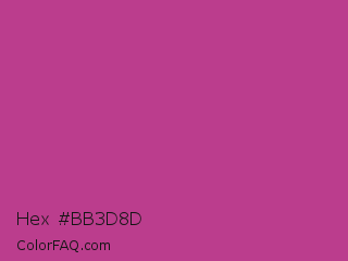 Hex #bb3d8d Color is a normal magenta color and the nearest color is Fandango #b53389. Hex code #bb3d8d and RGB value is rgb(187,61,141). In RGB color space, this color is composed of 73% red, 24% green, 55% blue, In CMYK color space, this color is composed of 0% cyan, 67% magenta, 25% yellow , 27% black , In HSL color space, this color has a hue angle of 322° , 51% saturation and 49% lightness.