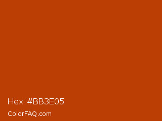 Hex #bb3e05 Color is a normal orange color and the nearest color is Mahogany #c04000. Hex code #bb3e05 and RGB value is rgb(187,62,5). In RGB color space, this color is composed of 73% red, 24% green, 2% blue, In CMYK color space, this color is composed of 0% cyan, 67% magenta, 97% yellow , 27% black , In HSL color space, this color has a hue angle of 19° , 95% saturation and 38% lightness.
