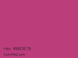Hex #bb3e7b Color is a normal rose color and the nearest color is Fuchsia Rose #c74375. Hex code #bb3e7b and RGB value is rgb(187,62,123). In RGB color space, this color is composed of 73% red, 24% green, 48% blue, In CMYK color space, this color is composed of 0% cyan, 67% magenta, 34% yellow , 27% black , In HSL color space, this color has a hue angle of 331° , 50% saturation and 49% lightness.