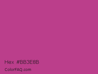 Hex #bb3e8b Color is a normal magenta color and the nearest color is Medium Red Violet #bb3385. Hex code #bb3e8b and RGB value is rgb(187,62,139). In RGB color space, this color is composed of 73% red, 24% green, 55% blue, In CMYK color space, this color is composed of 0% cyan, 67% magenta, 26% yellow , 27% black , In HSL color space, this color has a hue angle of 323° , 50% saturation and 49% lightness.