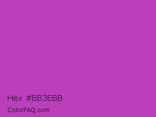 Hex #bb3ebb Color is a normal magenta color and the nearest color is Fuchsia Pink #c154c1. Hex code #bb3ebb and RGB value is rgb(187,62,187). In RGB color space, this color is composed of 73% red, 24% green, 73% blue, In CMYK color space, this color is composed of 0% cyan, 67% magenta, 0% yellow , 27% black , In HSL color space, this color has a hue angle of 300° , 50% saturation and 49% lightness.