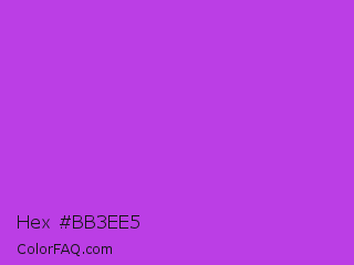 Hex #bb3ee5 Color is a normal purple color and the nearest color is Medium Orchid #ba55d3. Hex code #bb3ee5 and RGB value is rgb(187,62,229). In RGB color space, this color is composed of 73% red, 24% green, 90% blue, In CMYK color space, this color is composed of 18% cyan, 73% magenta, 0% yellow , 10% black , In HSL color space, this color has a hue angle of 285° , 76% saturation and 57% lightness.