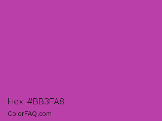 Hex #bb3fa8 Color is a normal magenta color and the nearest color is Byzantine #bd33a4. Hex code #bb3fa8 and RGB value is rgb(187,63,168). In RGB color space, this color is composed of 73% red, 25% green, 66% blue, In CMYK color space, this color is composed of 0% cyan, 66% magenta, 10% yellow , 27% black , In HSL color space, this color has a hue angle of 309° , 50% saturation and 49% lightness.