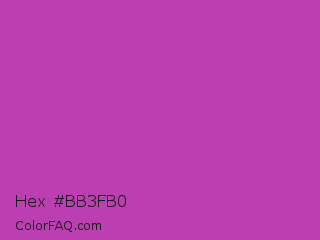 Hex #bb3fb0 Color is a normal magenta color and the nearest color is Byzantine #bd33a4. Hex code #bb3fb0 and RGB value is rgb(187,63,176). In RGB color space, this color is composed of 73% red, 25% green, 69% blue, In CMYK color space, this color is composed of 0% cyan, 66% magenta, 6% yellow , 27% black , In HSL color space, this color has a hue angle of 305° , 50% saturation and 49% lightness.