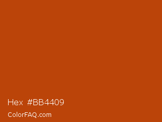 Hex #bb4409 Color is a normal orange color and the nearest color is Rock Spray #ba450c. Hex code #bb4409 and RGB value is rgb(187,68,9). In RGB color space, this color is composed of 73% red, 27% green, 4% blue, In CMYK color space, this color is composed of 0% cyan, 64% magenta, 95% yellow , 27% black , In HSL color space, this color has a hue angle of 20° , 91% saturation and 38% lightness.