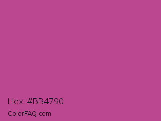 Hex #bb4790 Color is a normal magenta color and the nearest color is Mulberry #c54b8c. Hex code #bb4790 and RGB value is rgb(187,71,144). In RGB color space, this color is composed of 73% red, 28% green, 56% blue, In CMYK color space, this color is composed of 0% cyan, 62% magenta, 23% yellow , 27% black , In HSL color space, this color has a hue angle of 322° , 46% saturation and 51% lightness.