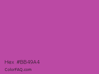 Hex #bb49a4 Color is a normal magenta color and the nearest color is Byzantine #bd33a4. Hex code #bb49a4 and RGB value is rgb(187,73,164). In RGB color space, this color is composed of 73% red, 29% green, 64% blue, In CMYK color space, this color is composed of 0% cyan, 61% magenta, 12% yellow , 27% black , In HSL color space, this color has a hue angle of 312° , 46% saturation and 51% lightness.