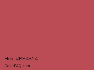 Hex #bb4b54 Color is a normal red color and the nearest color is Bittersweet Shimmer #bf4f51. Hex code #bb4b54 and RGB value is rgb(187,75,84). In RGB color space, this color is composed of 73% red, 29% green, 33% blue, In CMYK color space, this color is composed of 0% cyan, 60% magenta, 55% yellow , 27% black , In HSL color space, this color has a hue angle of 355° , 45% saturation and 51% lightness.