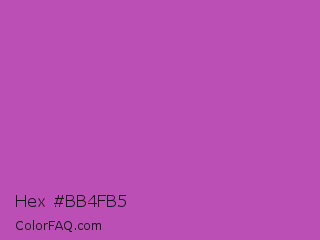 Hex #bb4fb5 Color is a normal magenta color and the nearest color is Fuchsia Pink #c154c1. Hex code #bb4fb5 and RGB value is rgb(187,79,181). In RGB color space, this color is composed of 73% red, 31% green, 71% blue, In CMYK color space, this color is composed of 0% cyan, 58% magenta, 3% yellow , 27% black , In HSL color space, this color has a hue angle of 303° , 44% saturation and 52% lightness.