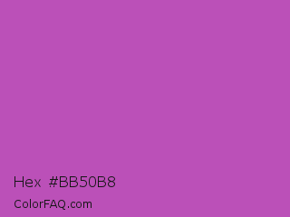 Hex #bb50b8 Color is a normal magenta color and the nearest color is Fuchsia Pink #c154c1. Hex code #bb50b8 and RGB value is rgb(187,80,184). In RGB color space, this color is composed of 73% red, 31% green, 72% blue, In CMYK color space, this color is composed of 0% cyan, 57% magenta, 2% yellow , 27% black , In HSL color space, this color has a hue angle of 302° , 44% saturation and 52% lightness.