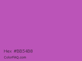 Hex #bb54b8 Color is a normal magenta color and the nearest color is Fuchsia Pink #c154c1. Hex code #bb54b8 and RGB value is rgb(187,84,184). In RGB color space, this color is composed of 73% red, 33% green, 72% blue, In CMYK color space, this color is composed of 0% cyan, 55% magenta, 2% yellow , 27% black , In HSL color space, this color has a hue angle of 302° , 43% saturation and 53% lightness.