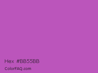 Hex #bb55bb Color is a normal magenta color and the nearest color is Fuchsia Pink #c154c1. Hex code #bb55bb and RGB value is rgb(187,85,187). In RGB color space, this color is composed of 73% red, 33% green, 73% blue, In CMYK color space, this color is composed of 0% cyan, 55% magenta, 0% yellow , 27% black , In HSL color space, this color has a hue angle of 300° , 43% saturation and 53% lightness.