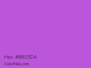 Hex #bb55da Color is a normal purple color and the nearest color is Medium Orchid #ba55d3. Hex code #bb55da and RGB value is rgb(187,85,218). In RGB color space, this color is composed of 73% red, 33% green, 85% blue, In CMYK color space, this color is composed of 14% cyan, 61% magenta, 0% yellow , 15% black , In HSL color space, this color has a hue angle of 286° , 64% saturation and 59% lightness.