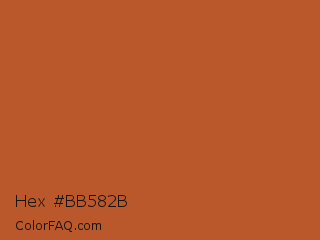 Hex #bb582b Color is a normal orange color and the nearest color is Tuscany #bd5e2e. Hex code #bb582b and RGB value is rgb(187,88,43). In RGB color space, this color is composed of 73% red, 35% green, 17% blue, In CMYK color space, this color is composed of 0% cyan, 53% magenta, 77% yellow , 27% black , In HSL color space, this color has a hue angle of 19° , 63% saturation and 45% lightness.