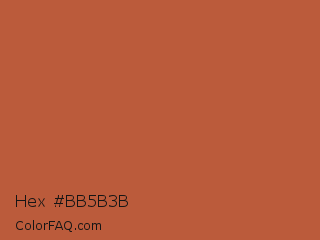 Hex #bb5b3b Color is a normal color and the nearest color is Crail #b95140. Hex code #bb5b3b and RGB value is rgb(187,91,59). In RGB color space, this color is composed of 73% red, 36% green, 23% blue, In CMYK color space, this color is composed of 0% cyan, 51% magenta, 68% yellow , 27% black , In HSL color space, this color has a hue angle of 15° , 52% saturation and 48% lightness.
