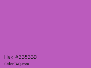 Hex #bb5bbd Color is a normal magenta color and the nearest color is Fuchsia Pink #c154c1. Hex code #bb5bbd and RGB value is rgb(187,91,189). In RGB color space, this color is composed of 73% red, 36% green, 74% blue, In CMYK color space, this color is composed of 1% cyan, 52% magenta, 0% yellow , 26% black , In HSL color space, this color has a hue angle of 299° , 43% saturation and 55% lightness.