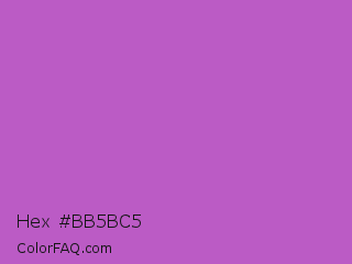 Hex #bb5bc5 Color is a normal magenta color and the nearest color is Fuchsia Pink #c154c1. Hex code #bb5bc5 and RGB value is rgb(187,91,197). In RGB color space, this color is composed of 73% red, 36% green, 77% blue, In CMYK color space, this color is composed of 5% cyan, 54% magenta, 0% yellow , 23% black , In HSL color space, this color has a hue angle of 294° , 48% saturation and 56% lightness.