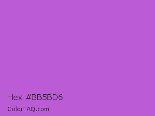 Hex #bb5bd6 Color is a normal purple color and the nearest color is Medium Orchid #ba55d3. Hex code #bb5bd6 and RGB value is rgb(187,91,214). In RGB color space, this color is composed of 73% red, 36% green, 84% blue, In CMYK color space, this color is composed of 13% cyan, 57% magenta, 0% yellow , 16% black , In HSL color space, this color has a hue angle of 287° , 60% saturation and 60% lightness.
