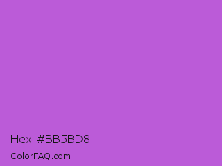 Hex #bb5bd8 Color is a normal purple color and the nearest color is Medium Orchid #ba55d3. Hex code #bb5bd8 and RGB value is rgb(187,91,216). In RGB color space, this color is composed of 73% red, 36% green, 85% blue, In CMYK color space, this color is composed of 13% cyan, 58% magenta, 0% yellow , 15% black , In HSL color space, this color has a hue angle of 286° , 62% saturation and 60% lightness.