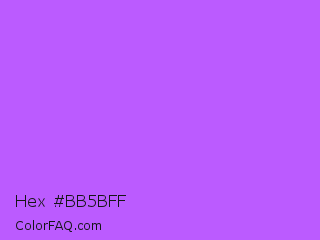 Hex #bb5bff Color is a light purple color and the nearest color is Heliotrope #df73ff. Hex code #bb5bff and RGB value is rgb(187,91,255). In RGB color space, this color is composed of 73% red, 36% green, 100% blue, In CMYK color space, this color is composed of 27% cyan, 64% magenta, 0% yellow , 0% black , In HSL color space, this color has a hue angle of 275° , 100% saturation and 68% lightness.