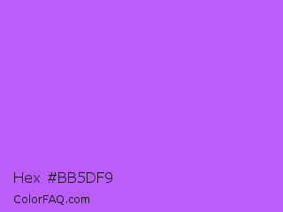 Hex #bb5df9 Color is a light purple color and the nearest color is Medium Orchid #ba55d3. Hex code #bb5df9 and RGB value is rgb(187,93,249). In RGB color space, this color is composed of 73% red, 36% green, 98% blue, In CMYK color space, this color is composed of 25% cyan, 63% magenta, 0% yellow , 2% black , In HSL color space, this color has a hue angle of 276° , 93% saturation and 67% lightness.