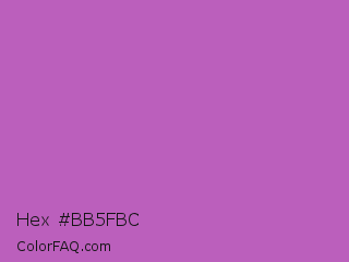 Hex #bb5fbc Color is a normal magenta color and the nearest color is Fuchsia Pink #c154c1. Hex code #bb5fbc and RGB value is rgb(187,95,188). In RGB color space, this color is composed of 73% red, 37% green, 74% blue, In CMYK color space, this color is composed of 1% cyan, 49% magenta, 0% yellow , 26% black , In HSL color space, this color has a hue angle of 299° , 41% saturation and 55% lightness.