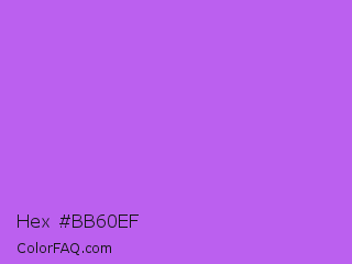 Hex #bb60ef Color is a light purple color and the nearest color is Rich Lilac #b666d2. Hex code #bb60ef and RGB value is rgb(187,96,239). In RGB color space, this color is composed of 73% red, 38% green, 94% blue, In CMYK color space, this color is composed of 22% cyan, 60% magenta, 0% yellow , 6% black , In HSL color space, this color has a hue angle of 278° , 82% saturation and 66% lightness.