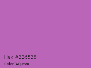 Hex #bb65b8 Color is a normal magenta color and the nearest color is Fuchsia Pink #c154c1. Hex code #bb65b8 and RGB value is rgb(187,101,184). In RGB color space, this color is composed of 73% red, 40% green, 72% blue, In CMYK color space, this color is composed of 0% cyan, 46% magenta, 2% yellow , 27% black , In HSL color space, this color has a hue angle of 302° , 39% saturation and 56% lightness.