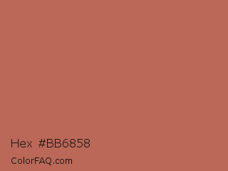 Hex #bb6858 Color is a normal red color and the nearest color is Santa Fe #b16d52. Hex code #bb6858 and RGB value is rgb(187,104,88). In RGB color space, this color is composed of 73% red, 41% green, 35% blue, In CMYK color space, this color is composed of 0% cyan, 44% magenta, 53% yellow , 27% black , In HSL color space, this color has a hue angle of 10° , 42% saturation and 54% lightness.
