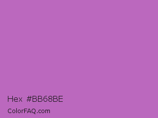Hex #bb68be Color is a normal magenta color and the nearest color is Rich Lilac #b666d2. Hex code #bb68be and RGB value is rgb(187,104,190). In RGB color space, this color is composed of 73% red, 41% green, 75% blue, In CMYK color space, this color is composed of 2% cyan, 45% magenta, 0% yellow , 25% black , In HSL color space, this color has a hue angle of 298° , 40% saturation and 58% lightness.