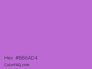 Hex #bb6ad4 Color is a light purple color and the nearest color is Rich Lilac #b666d2. Hex code #bb6ad4 and RGB value is rgb(187,106,212). In RGB color space, this color is composed of 73% red, 42% green, 83% blue, In CMYK color space, this color is composed of 12% cyan, 50% magenta, 0% yellow , 17% black , In HSL color space, this color has a hue angle of 286° , 55% saturation and 62% lightness.