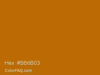 Hex #bb6b03 Color is a normal orange color and the nearest color is Indochine #c26b03. Hex code #bb6b03 and RGB value is rgb(187,107,3). In RGB color space, this color is composed of 73% red, 42% green, 1% blue, In CMYK color space, this color is composed of 0% cyan, 43% magenta, 98% yellow , 27% black , In HSL color space, this color has a hue angle of 34° , 97% saturation and 37% lightness.