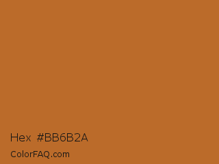 Hex #bb6b2a Color is a normal orange color and the nearest color is Liver Dogs #b86d29. Hex code #bb6b2a and RGB value is rgb(187,107,42). In RGB color space, this color is composed of 73% red, 42% green, 16% blue, In CMYK color space, this color is composed of 0% cyan, 43% magenta, 78% yellow , 27% black , In HSL color space, this color has a hue angle of 27° , 63% saturation and 45% lightness.
