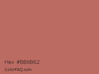 Hex #bb6b62 Color is a normal red color and the nearest color is Contessa #c6726b. Hex code #bb6b62 and RGB value is rgb(187,107,98). In RGB color space, this color is composed of 73% red, 42% green, 38% blue, In CMYK color space, this color is composed of 0% cyan, 43% magenta, 48% yellow , 27% black , In HSL color space, this color has a hue angle of 6° , 40% saturation and 56% lightness.