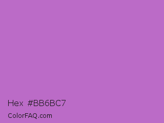 Hex #bb6bc7 Color is a normal magenta color and the nearest color is Rich Lilac #b666d2. Hex code #bb6bc7 and RGB value is rgb(187,107,199). In RGB color space, this color is composed of 73% red, 42% green, 78% blue, In CMYK color space, this color is composed of 6% cyan, 46% magenta, 0% yellow , 22% black , In HSL color space, this color has a hue angle of 292° , 45% saturation and 60% lightness.