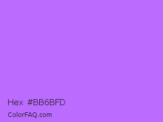 Hex #bb6bfd Color is a light purple color and the nearest color is Heliotrope #df73ff. Hex code #bb6bfd and RGB value is rgb(187,107,253). In RGB color space, this color is composed of 73% red, 42% green, 99% blue, In CMYK color space, this color is composed of 26% cyan, 58% magenta, 0% yellow , 1% black , In HSL color space, this color has a hue angle of 273° , 97% saturation and 71% lightness.