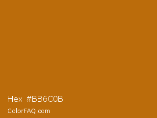 Hex #bb6c0b Color is a normal orange color and the nearest color is Indochine #c26b03. Hex code #bb6c0b and RGB value is rgb(187,108,11). In RGB color space, this color is composed of 73% red, 42% green, 4% blue, In CMYK color space, this color is composed of 0% cyan, 42% magenta, 94% yellow , 27% black , In HSL color space, this color has a hue angle of 33° , 89% saturation and 39% lightness.