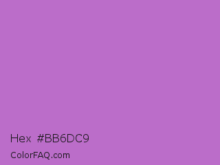Hex #bb6dc9 Color is a light purple color and the nearest color is Rich Lilac #b666d2. Hex code #bb6dc9 and RGB value is rgb(187,109,201). In RGB color space, this color is composed of 73% red, 43% green, 79% blue, In CMYK color space, this color is composed of 7% cyan, 46% magenta, 0% yellow , 21% black , In HSL color space, this color has a hue angle of 291° , 46% saturation and 61% lightness.