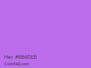 Hex #bb6deb Color is a light purple color and the nearest color is Lavender #b57edc. Hex code #bb6deb and RGB value is rgb(187,109,235). In RGB color space, this color is composed of 73% red, 43% green, 92% blue, In CMYK color space, this color is composed of 20% cyan, 54% magenta, 0% yellow , 8% black , In HSL color space, this color has a hue angle of 277° , 76% saturation and 67% lightness.