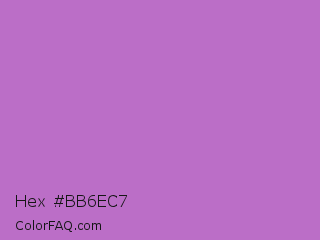 Hex #bb6ec7 Color is a light magenta color and the nearest color is Rich Lilac #b666d2. Hex code #bb6ec7 and RGB value is rgb(187,110,199). In RGB color space, this color is composed of 73% red, 43% green, 78% blue, In CMYK color space, this color is composed of 6% cyan, 45% magenta, 0% yellow , 22% black , In HSL color space, this color has a hue angle of 292° , 44% saturation and 61% lightness.