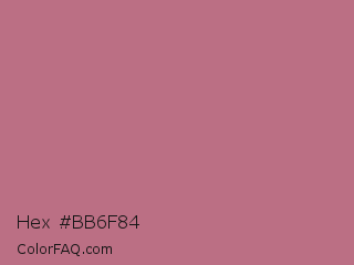 Hex #bb6f84 Color is a normal rose color and the nearest color is Turkish Rose #b57281. Hex code #bb6f84 and RGB value is rgb(187,111,132). In RGB color space, this color is composed of 73% red, 44% green, 52% blue, In CMYK color space, this color is composed of 0% cyan, 41% magenta, 29% yellow , 27% black , In HSL color space, this color has a hue angle of 343° , 36% saturation and 58% lightness.