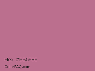 Hex #bb6f8e Color is a normal rose color and the nearest color is Turkish Rose #b57281. Hex code #bb6f8e and RGB value is rgb(187,111,142). In RGB color space, this color is composed of 73% red, 44% green, 56% blue, In CMYK color space, this color is composed of 0% cyan, 41% magenta, 24% yellow , 27% black , In HSL color space, this color has a hue angle of 336° , 36% saturation and 58% lightness.
