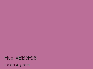 Hex #bb6f98 Color is a normal rose color and the nearest color is Pearly Purple #b768a2. Hex code #bb6f98 and RGB value is rgb(187,111,152). In RGB color space, this color is composed of 73% red, 44% green, 60% blue, In CMYK color space, this color is composed of 0% cyan, 41% magenta, 19% yellow , 27% black , In HSL color space, this color has a hue angle of 328° , 36% saturation and 58% lightness.