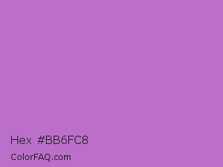 Hex #bb6fc8 Color is a light purple color and the nearest color is Rich Lilac #b666d2. Hex code #bb6fc8 and RGB value is rgb(187,111,200). In RGB color space, this color is composed of 73% red, 44% green, 78% blue, In CMYK color space, this color is composed of 7% cyan, 45% magenta, 0% yellow , 22% black , In HSL color space, this color has a hue angle of 291° , 45% saturation and 61% lightness.