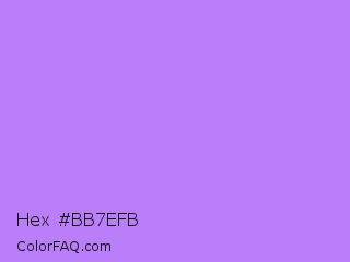 Hex #bb7efb Color is a light violet color and the nearest color is Lavender #b57edc. Hex code #bb7efb and RGB value is rgb(187,126,251). In RGB color space, this color is composed of 73% red, 49% green, 98% blue, In CMYK color space, this color is composed of 25% cyan, 50% magenta, 0% yellow , 2% black , In HSL color space, this color has a hue angle of 269° , 94% saturation and 74% lightness.