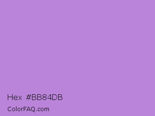 Hex #bb84db Color is a light purple color and the nearest color is Lavender #b57edc. Hex code #bb84db and RGB value is rgb(187,132,219). In RGB color space, this color is composed of 73% red, 52% green, 86% blue, In CMYK color space, this color is composed of 15% cyan, 40% magenta, 0% yellow , 14% black , In HSL color space, this color has a hue angle of 278° , 55% saturation and 69% lightness.