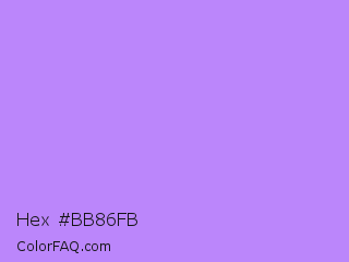Hex #bb86fb Color is a light violet color and the nearest color is Pale Violet #cc99ff. Hex code #bb86fb and RGB value is rgb(187,134,251). In RGB color space, this color is composed of 73% red, 53% green, 98% blue, In CMYK color space, this color is composed of 25% cyan, 47% magenta, 0% yellow , 2% black , In HSL color space, this color has a hue angle of 267° , 94% saturation and 75% lightness.