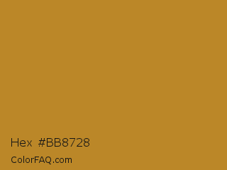 Hex #bb8728 Color is a normal orange color and the nearest color is University Of California Gold #b78727. Hex code #bb8728 and RGB value is rgb(187,135,40). In RGB color space, this color is composed of 73% red, 53% green, 16% blue, In CMYK color space, this color is composed of 0% cyan, 28% magenta, 79% yellow , 27% black , In HSL color space, this color has a hue angle of 39° , 65% saturation and 45% lightness.